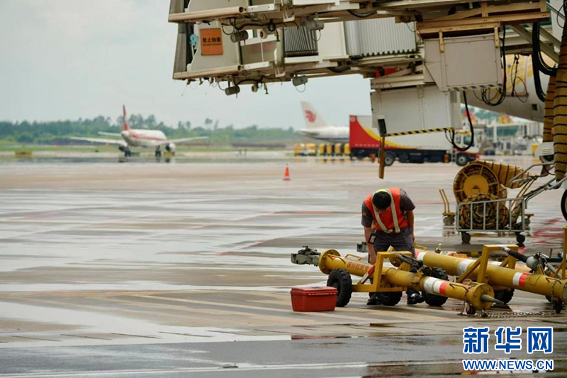 海航技术中南基地技术人员对牵引杆进行仔细检查,确保设备没有因台风而损坏,为航班的安全保驾护航。新华网发