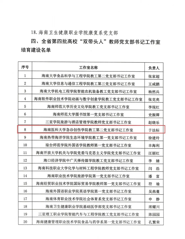 同时,海南医科大学第三联合(护理与西英联合)党委入选“全省党建工作标杆院系”培育建设单位,马克思主义学院纲要与形策党支部入选“全省党建工作样板支部”培育建设单位,生命科学与医学技术学院功能材料与分子影像党支部书记工作室(原急诊创伤学院教工第二党支部书记工作室)入选“双带头人”教师党支部书记工作室培育建设名单。