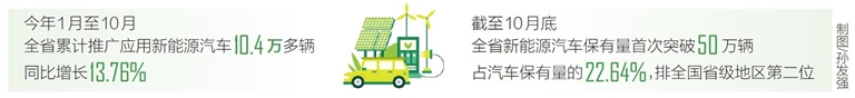据介绍,我省新能源汽车市场已进入“大众化”普及阶段。截至10月底,全省新能源汽车保有量首次突破50万辆,占汽车保有量的22.64%,排全国省级地区第二位。