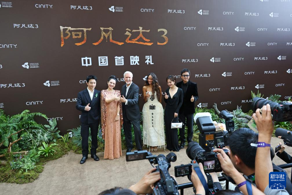 12月8日,电影《阿凡达3》中国首映礼在海南三亚举行,导演詹姆斯·卡梅隆(左三)携主创亮相。新华社发