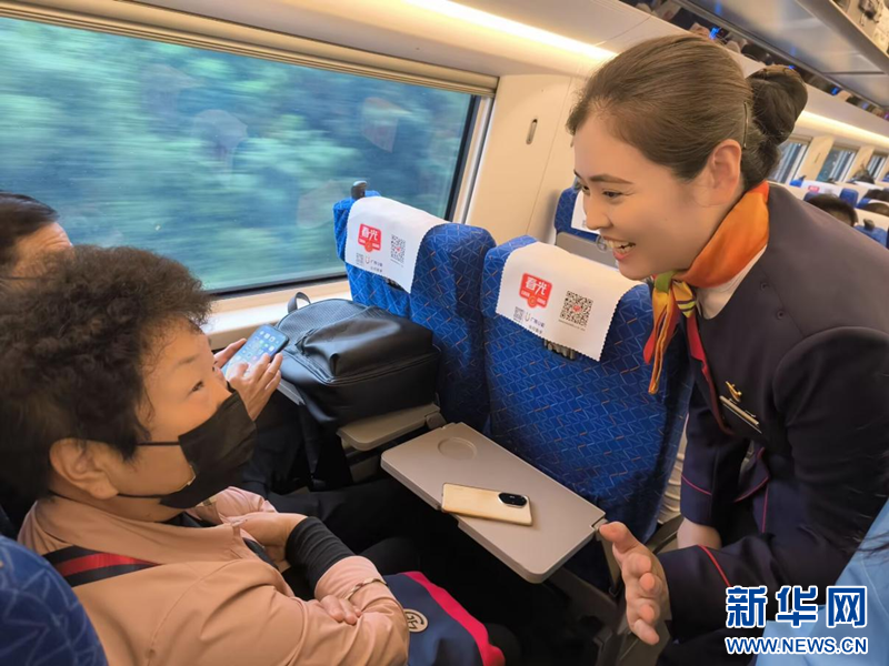 海口车务段海南动车队乘务二组班长梁希影和乘客交谈。新华网发
