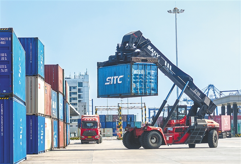 在洋浦港口岸集装箱集中查验场地,工作人员有序转运集装箱。海南日报全媒体记者 陈元才 通讯员 舒翔 匡林夕 摄
