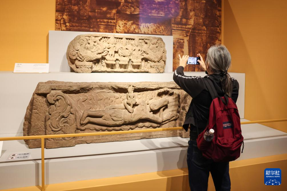 1月22日,观众在中国(海南)南海博物馆里拍摄“水与石的史诗——柬埔寨古代文明特展”展出的石雕门楣。新华社记者 张丽芸 摄