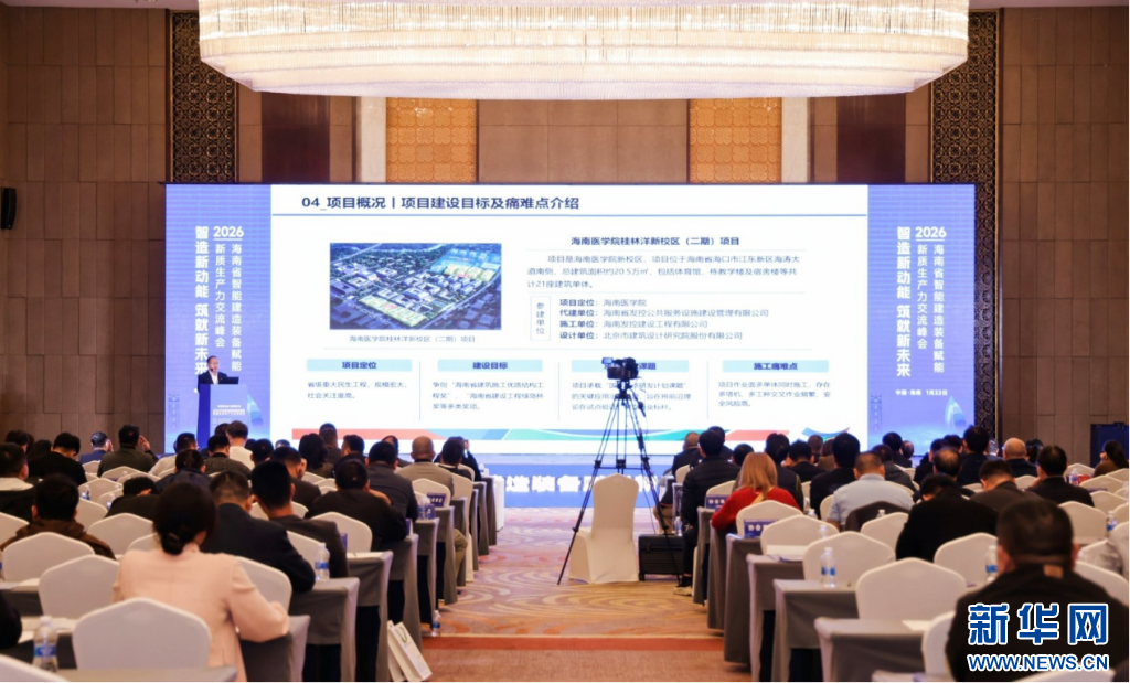 1月22日,“2026年海南省智能建造装备赋能新质生产力交流峰会”在海口成功举办。海南控股旗下海控城市综合运营集团所属海南发控建设工程有限公司(以下简称“海控建设”),作为海南省国有建设企业代表受邀出席,并在峰会上作题为《智造未来,协同共进:海南医科大学桂林洋新校区(二期)智能建造应用汇报》的典型案例分享,全面展现企业在智能建造领域的创新实践与成果。