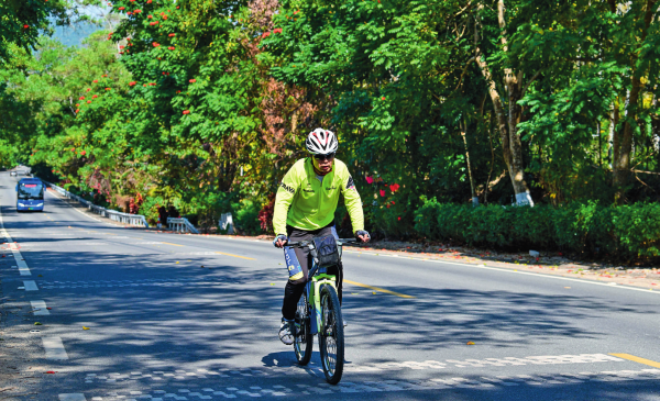 游客在位于海南的环热带雨林国家公园旅游公路保亭段骑行 (2025 年 1 月 30 日摄) 蒲晓旭摄 / 本刊