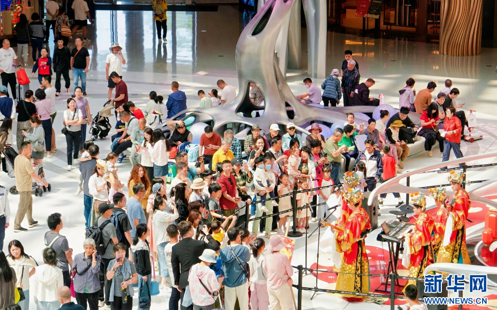 春节期间,cdf海口国际免税城的表演吸引众多市民游客围观。