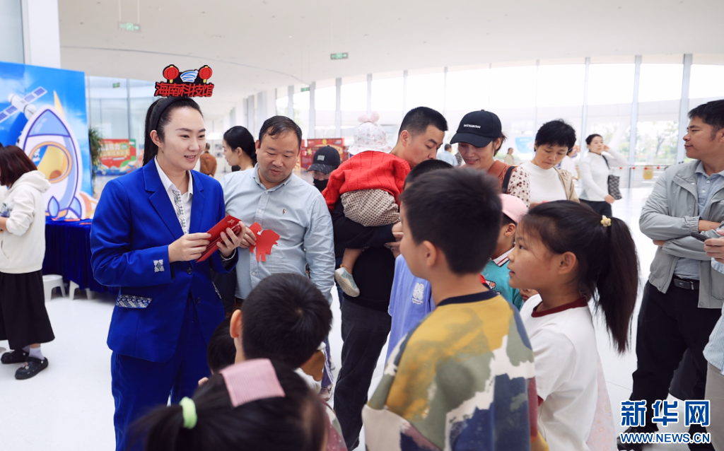春节期间,海南科技馆工作人员和小朋友互动。