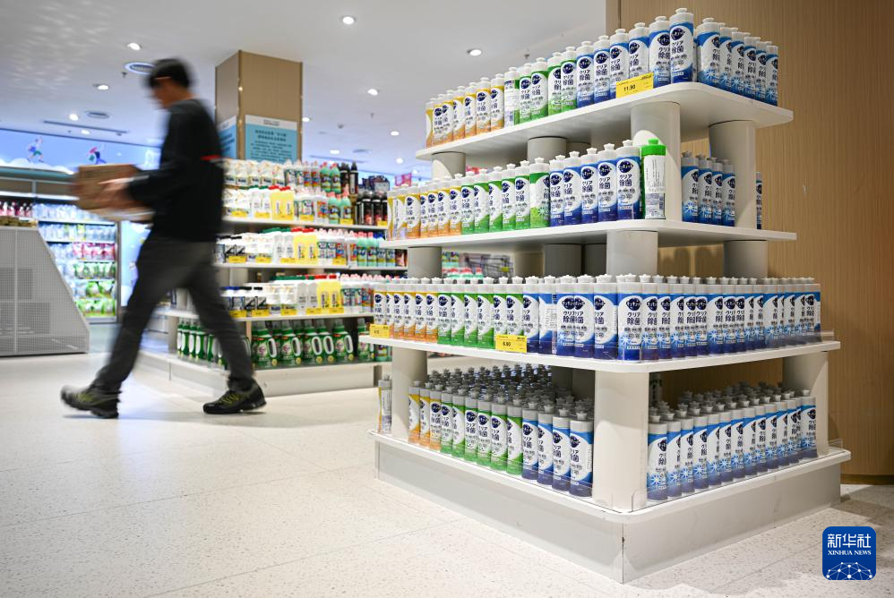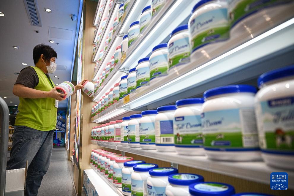 3月12日,工作人员在海口旺豪日用消费品免税店摆放免税奶粉。新华社记者 蒲晓旭 摄