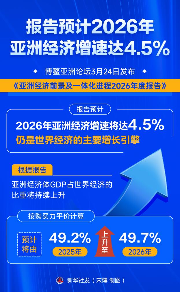 博鳌亚洲论坛3月24日发布《亚洲经济前景及一体化进程2026年度报告》。报告预计,2026年亚洲经济增速将达4.5%,仍是世界经济的主要增长引擎。新华社发 宋博 制图