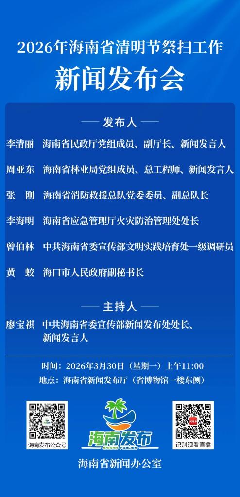 2026年3月30日上午11时,海南省新闻办公室将在海南省新闻发布厅(省博物馆一楼东侧)举行2026年海南省清明节祭扫工作新闻发布会。届时,海南省民政厅、海南省林业局、海南省消防救援总队、海南省应急管理厅火灾防治管理处、中共海南省委宣传部文明实践培育处、海口市人民政府相关负责人将介绍有关情况,并答记者问。