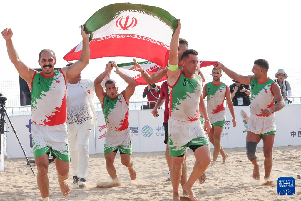 新华社三亚4月27日电(记者丁文娴、胡佳丽)在27日进行的第六届亚沙会沙滩卡巴迪男子决赛中,伊朗队44:31击败印度队,以全胜战绩夺冠。赛后队员们展开两面国旗,高举着绕场庆祝,而后又把国旗铺在地上跪地亲吻。